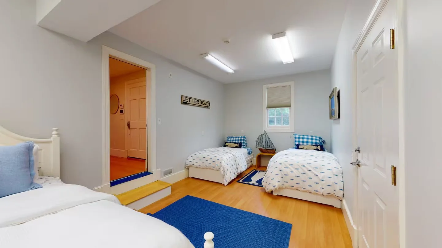 The lower level includes a cozy media room with a large TV for movie nights, a well-equipped kitchenette (microwave, fridge, sink, and ice machine), and a fun bunkroom with three Twin beds and an en suite bathroom—ideal for kids, extra guests, or an au pair. A laundry room with two sets of washer-dryers adds convenience for extended stays.