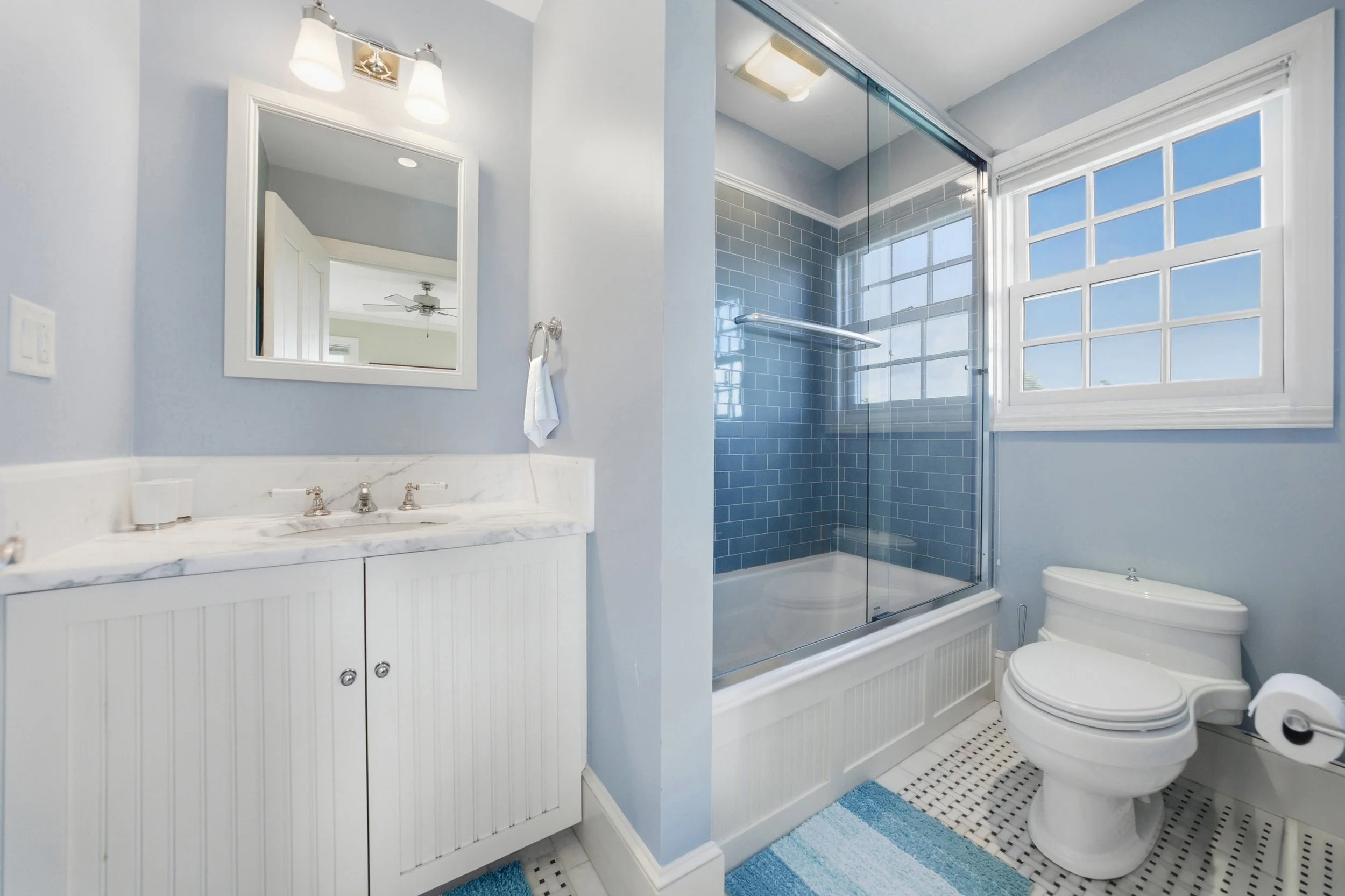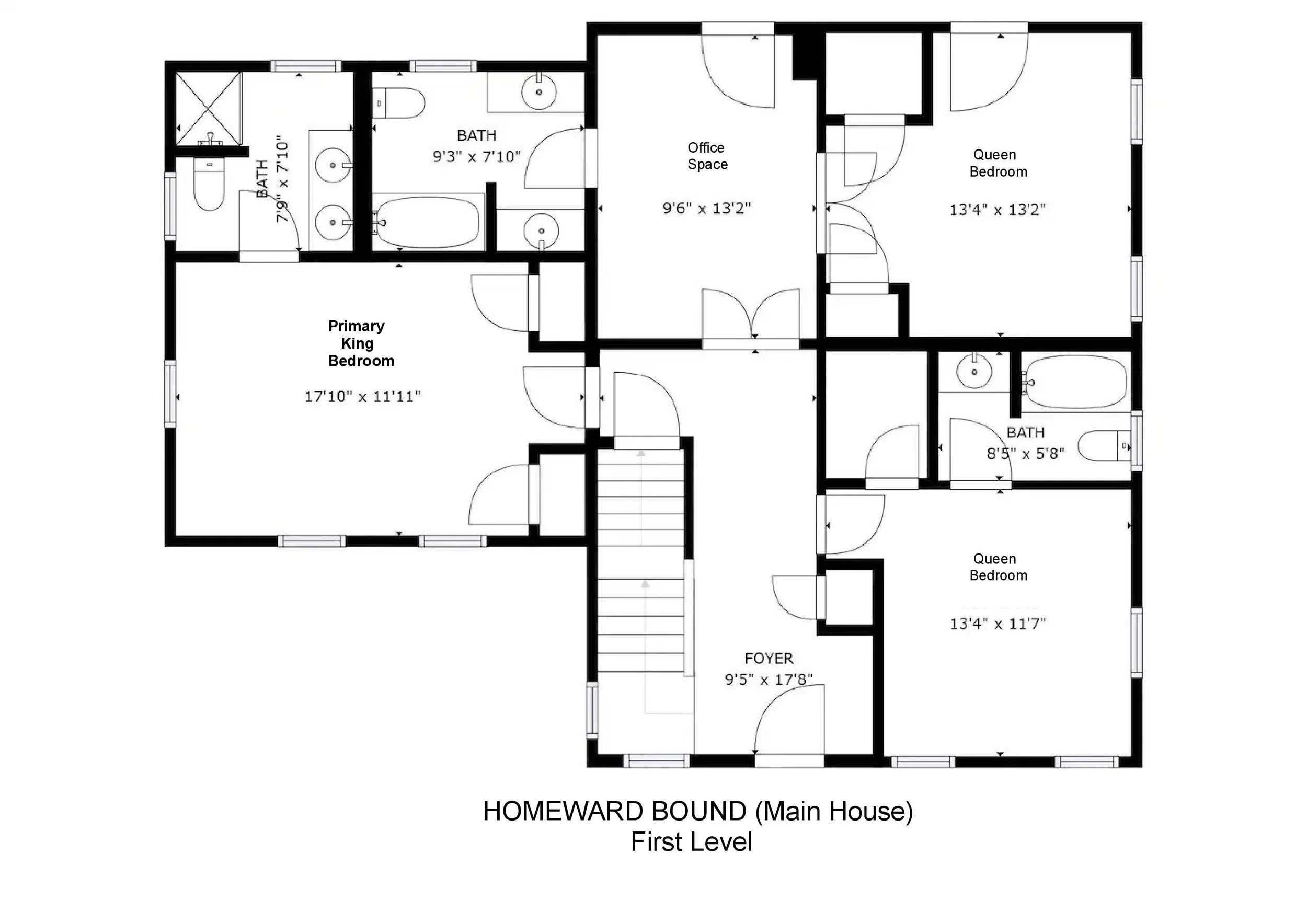 The main house features a thoughtful layout with tranquil bedrooms and bright, open living spaces. On the first floor, you’ll find a King bedroom with an en suite bathroom, along with two additional Queen bedrooms. Upstairs, a sunlit kitchen with granite countertops and a central island flows seamlessly into the dining and living areas. Also on this level is a second King bedroom with en suite bathroom and a convenient powder room. Large folding glass doors extend the living space to a deck with an outdoor fireplace, beautifully blending indoor comfort with outdoor living.